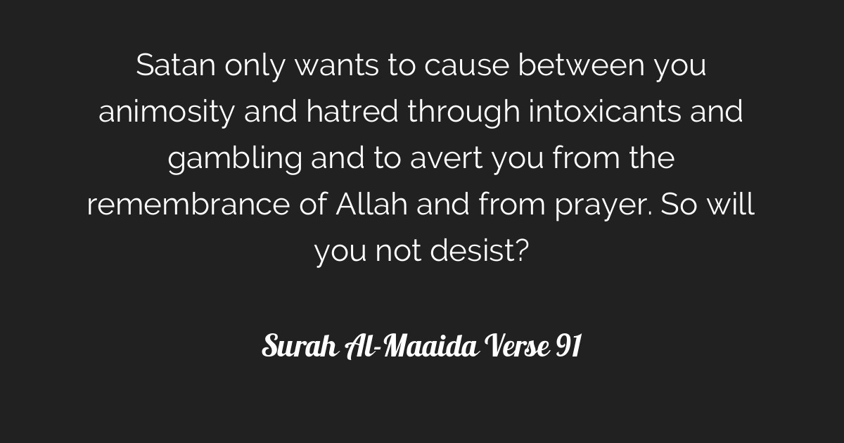 O you who have believed, indeed, intoxicants, gambling, sacrificing on stone alters to other than allah, and divining arrows are but defilement from . Allah swt telah menjelaskannya dalam al quran surat al maidah ayat 91,. But whoever returns to violation, then allah . In ayah 91, allah subhanahu wa ta'ala elucidates when shaytan commands us to consume khamr, maysir, and other forbidden things, what is it that . O you who have believed, do not kill game while you are in the state of ihram.
